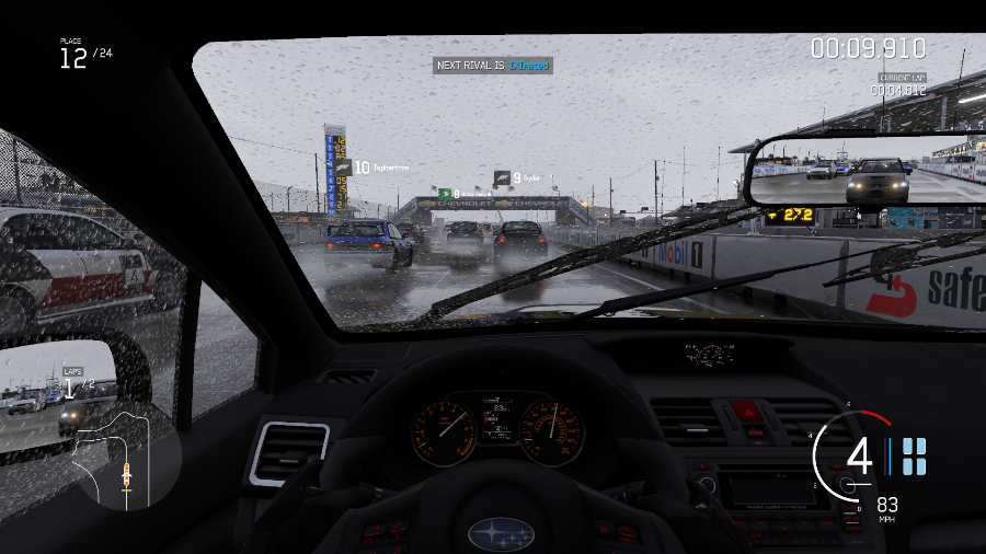 Having lived in New England my entire life, I'm accustomed to driving in some real shitty weather. For the first time in a mainline Forza title I can put some of those skills to use. Forza Horizon 2 introduced rain to the series, though it was mostly a visual impairment with some minor effects to the acutal driving mechanics. Forza 6 takes that foundation and does what Forza proper does: it simulates what driving in wet conditions will actually do to a car's handling. Wet grass is your mortal enemy. Deep puddles pool up on the track, and hitting them in a drift or accelerating through them will cause some nasty hydroplaning. The seasoned driver knows better than to hit the gas before they've broken the plane, or uses their knowledge of the track to avoid them altogether. Either way, the tar itself is slippery as fuck, and only gets worse with each consecutive lap when your tires heat up and lose traction. The rain effects on your windshield are incredible, and in open top cars you even get the appropriate streaking on your helmet's visor so it's doubly effective. The only thing that breaks the effect is the lack of obnoxious, blinding heavy misting you'd get from the cars in front of you, but from a playibility standpoint it makes things easier. Nighttime driving is another fan request that makes it's debut, and it certainly makes driving appropriately darker and more intense with only your headlights to guide you through certain turns and makes some tracks absolutely stunning (Yas Marina was made for this).