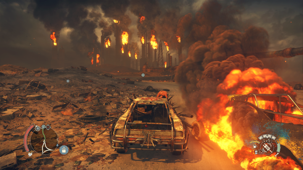 Bombing through the open wasteland is a joy, but when tasked with more precise control the driving mechanics can break down under scrutiny. Spinning out in the open desert usually isn't a big deal; it just makes a scrappy, impromptu car battle devolve into a demolition derby and it's still fun. When you transplant those same intentionally (?) sloppy, cinematic controls onto a race track or an enclosed environment is can be obnoxious. There a half dozen or so hubs around the world that allow you to participate in time trial races, unlocking a place to refuel and fast travel (but don't fast travel). These can be insanely frustrating, as you're usually asked to follow a set path while enemy vehicles slam you around allowing their AI buddies to take insurmountable leads. You can destroy these cars and kind of need to, but this may or may not help as the time taken to disable them can still slow you down enough to fuck you over. And fuck you if you so much as slightly rub a wall, hit a rock, or connect with a small incline at the wrong angle. The slightest mistake can easily spin you around and ruin your day, and these “mistakes” often seem like random acts of God thanks to a camera with a mind of it's own and unpredictable AI. Thankfully these are optional, with only one instance (though it's a ball buster) required for the main story. This is GTA-style nonsense. It may seem like a huge negative to concede to a Mad Max game having iffy driving controls, but I'll reiterate that it looks and feels great for the vast majority of the game.