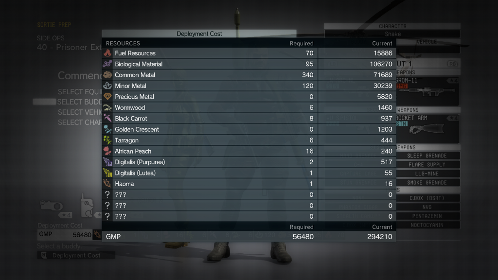 Missions range from “go here and take these guys out” to... that's about it. Some side ops mix it up a bit by having you disable landmines or tranquilizing and extracting animals, but the optimal route for roughly 90% of the missions is to knock dudes out and fulton them back to your base. The much touted Fulton Recovery System is basically a balloon you attach to enemies, animals, gun emplacements, cargo containers, etc. to extract them from the field and recruit them to work for you. The first couple times you attach the balloon to a sleeping sheep and send him skyward is pretty cute and funny. Around the hundredth or so time it's gotten old. Somewhere around the thousand mark it starts to set in that it's a pretty repetitive and annoying chore, and you more or less have to do it to keep your fucking mess of a convoluted, resource management mini-game that feels like it'd be at home on a free-to-play mobile game in check. Every now and then a unique objective will come through with a boss fight or vague, cryptic “puzzle” to solve, but these are more often than not bullshit. As an example: I was asked to fulton a certain truck out of hostile territory. It was in the middle of a convoy of tanks and APCs, driving to different outposts and picking up support along the way. I scouted and stalked the target, using my snake-like skills to pick off a couple soldiers in open-top vehicles, and setting EMP mines along it's predicted route. Once the mines stopped the convoy I called in some air support, blanketing the area with sleeping gas which laid down much of the problem. I still had two tanks and the target truck to deal with so I threw a trail of smoke grenades in a line, figuring I'd be able to use the cover to get close and balloon the truck away and deal with the tanks later. As I arrived at my destination, the Metal Gear-ness reared it's ugly head as a cutscene kicked in. Now... it wasn't particularly long, but after it played I was facing half a dozen armored enemies that had emerged from the truck, those two tanks, and I was stuck standing out in the open with no cover because my smoke screen had miraculously evaporated due to the cinema. Fuck you.