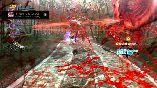 Other unique mechanics include blood pooling up on your weapon with every successful strike, which isn't just cosmetic. The more blood buildup the slower your attacks execute. You can switch to a secondary weapon or press LB to clean the blade (or chainsaw). Blood (and tits and ass) is definitely the theme here, as you have a gauge that fills as you are splattered in enemy viscera; once the gauge is filled you enter Rage Mode, improving your attack speed and damage but continually draining your health. If all of these gauges and systems sound complicated that's because they are. Keeping track of the HUD elements is a nightmare, and that's on top of learning each girl's unique skill/weapon set and what special moves/combos each of them are capable of performing. Fortunately the minutia is only really required for high level, higher difficulty play, and just having an understanding of the basics and button mashing your way through the game is a perfectly acceptable option for Normal mode. If you want to continue past that, the depth is certainly there for the dedicated. And Godspeed... you'll be busy for a long time.