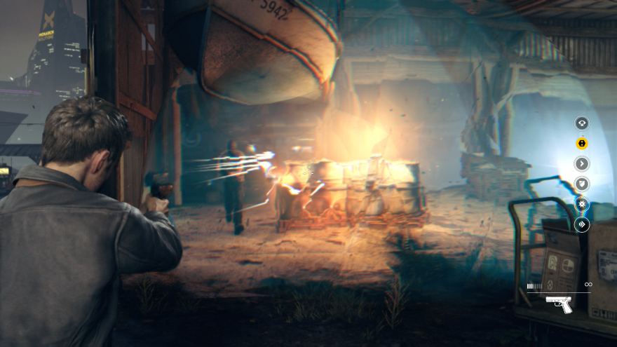 Quantum Break is a pretty game. Not quite “photo realistic”, there's a definite look to the game that's consistent and technically sound. There's a mix of convincingly dirty cityscapes and clinically sterile corporate offices, and the recognizable real world actors are... well, recognizable. It's a game about time travel and the end of time itself, so there's plenty of artistic interpretation of what rips in the fabric of time would look like as alternate timelines collide with each other. Jack Joyce, the main protagonist, is given time-altering powers from the start more or less, so there's plenty of fun with physics and tech demo levels of interaction with enemies and the environments. Fortunately, Quantum Break doesn't hang it's hat on graphics alone to deliver a shallow actual tech demo, instead opting for a narrative heavy, highly polished full game that presents the player with multiple options to affect the story and gameplay. The whole package is supplemented by four twenty minute live action cutscenes presented as television episodes. If that sounds dumb, I'll surprise you by stating these FMV productions are actually of above average quality even by modern cable TV standards. The game itself, however, is below average and I'm reviewing the game as a whole. It's not great.