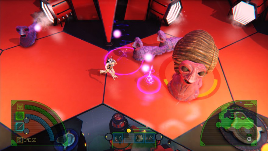 On the base level the game reminds me of console-centric action/RPGs like Marvel: Ultimate Alliance or Baldur's Gate: Dark Alliance. From an overhead view you have a standard melee attack which can be charged for a heavy attack, and a ranged weapon. As you progress you gain access to about a dozen different kinds of both types of weapons, and these can be upgraded by collecting components dropped by enemies or scattered around the environments. There are also perks like max HP increases, regenerating health, improved melee/ranged damage, etc. that can be earned by completing missions (main quests or side activities). You can swap between three different characters that have some unique skills needed to access certain areas, so there's also a bit of Metroidvania going on here. Other options include the ability to parry attacks, extend your jumps with a jetpack, and shoot downward when near a ledge (that one good feature of Dark Void). It all adds up to a surprising amount of depth in a fairly short, decidedly goofy comedy game.