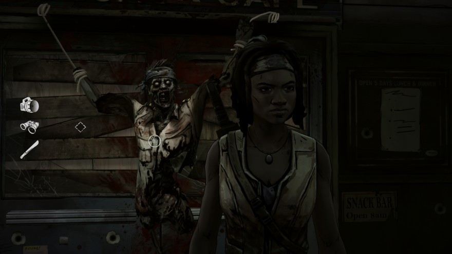 Episode One of The Walking Dead: Michonne is brutal from the start. It's a short time from booting the game to curb stomping walkers into fires and quick-timing your way to gory decapitations. The action sequences are stylishly letterboxed, and even go into John Woo slow motion at times to highlight the deadly efficiency of the title character. This is Michonne after all; one of the most badass characters this side of a Segio Leone film, and the game admirably does her justice for the most part.