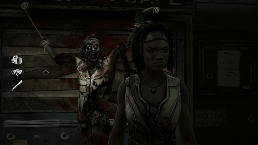 Aside from some flashbacks and hallucinations alluding to her past, you're thrust aboard a ship with little explanation or backstory, surrounded by characters you (as a player) don't really know. The game takes place during a certain time period in the comic books I'm not too familiar with, so the tie-ins/fan service were lost on me. But that's fine, as I was more than willing to just enjoy the journey the game wanted me to take. The story starts as a simple scavenging/rescue mission at a beached ferry, where you uncover some unsettling signs of nefarious shit going down. It's not long before you're predictably captured and taken to a Walking Dead signature settlement lead by a larger-than-life personality. And, rather predictably again, you're singled out and taken to have a face-to-face confrontation with said leader in a dialogue driven “boss battle”.