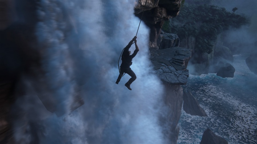 Like the newest, shiniest film in the box office, Uncharted 4 dazzles with visual fidelity. One of the best looking games to date, it's an impressive mix of both technical wizardry and smart art direction that's gorgeous yet unassuming. As you ascend a cliff side and are presented with a stunning vista the game doesn't linger, draw attention to it, or take control away from the player to rub their face in the art. It's there to enjoy, or you can just move on because there is plenty more eye candy down the line. It thankfully doesn't fall prey to tech demo status and feels that much more confident for it. There's a nice variety on display, too, from tropical islands to ruined mythical cities, an old mansion and a densely populated market, underground caves and the open ocean during a squall... Every scene is loaded with new palettes. It's not exactly aiming for photorealism: there's a cartoony brightness to everything, and at times there's some proportion distortion like the issues there were with early 3-D graphics or like you're looking through a fisheye lense, but aside from a few minor graphical hiccups it's undeniably solid.